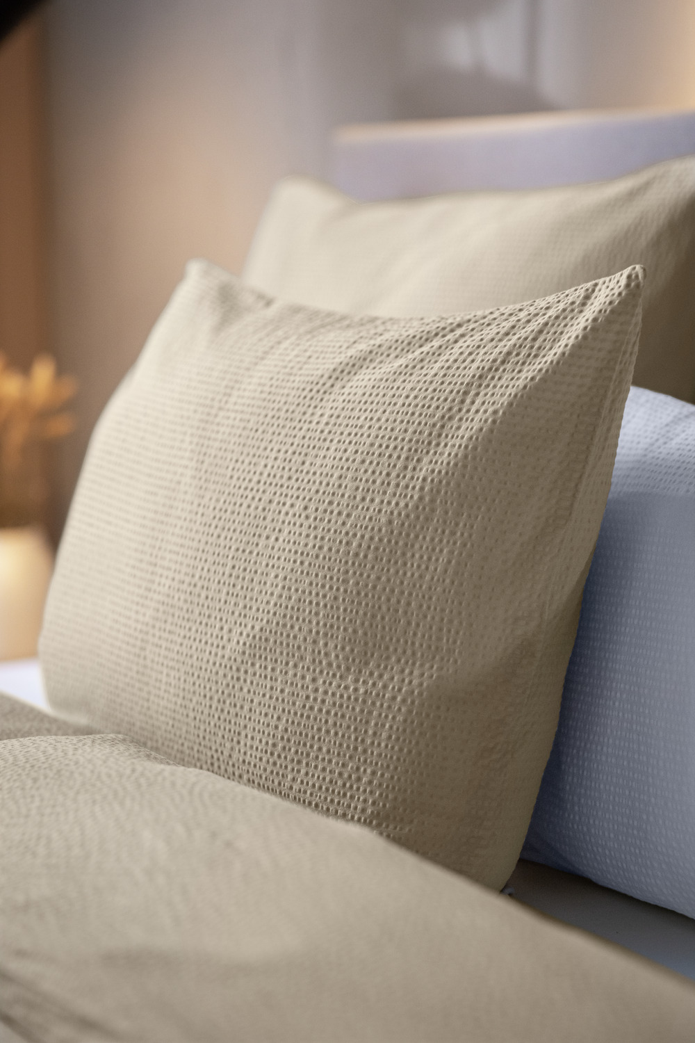 ##Avellino bed linen set – woven seersucker for pleasant sleeping comfort The Avellino bed linen set consists of a duvet cover and a pillowcase, specially made for the upmarket hotel and holiday sector. Made from 100% cotton in a high-quality, woven seersucker weave, it impresses with its elegant look, durability and particularly soft feel. The natural fabric is non-iron, breathable and temperature-regulating. With 140 threads per inch, the set retains its shape and colour even after several washes thanks to yarn dyeing. The hotel fastening ensures easy handling and a perfect fit. * Lightweight seersucker fabric made from 100% cotton * Weight approx. 115 g/m² – pleasantly light and breathable * Thread density (thread count): 140 threads per inch * Skin-friendly and temperature-regulating * Easy-care, no ironing necessary * With hotel fastening for easy handling * For comfortable sleep in a cosy atmosphere Info: The product develops its seersucker effect after three washes, as the fibres still contract during the first wash (shrinkage).