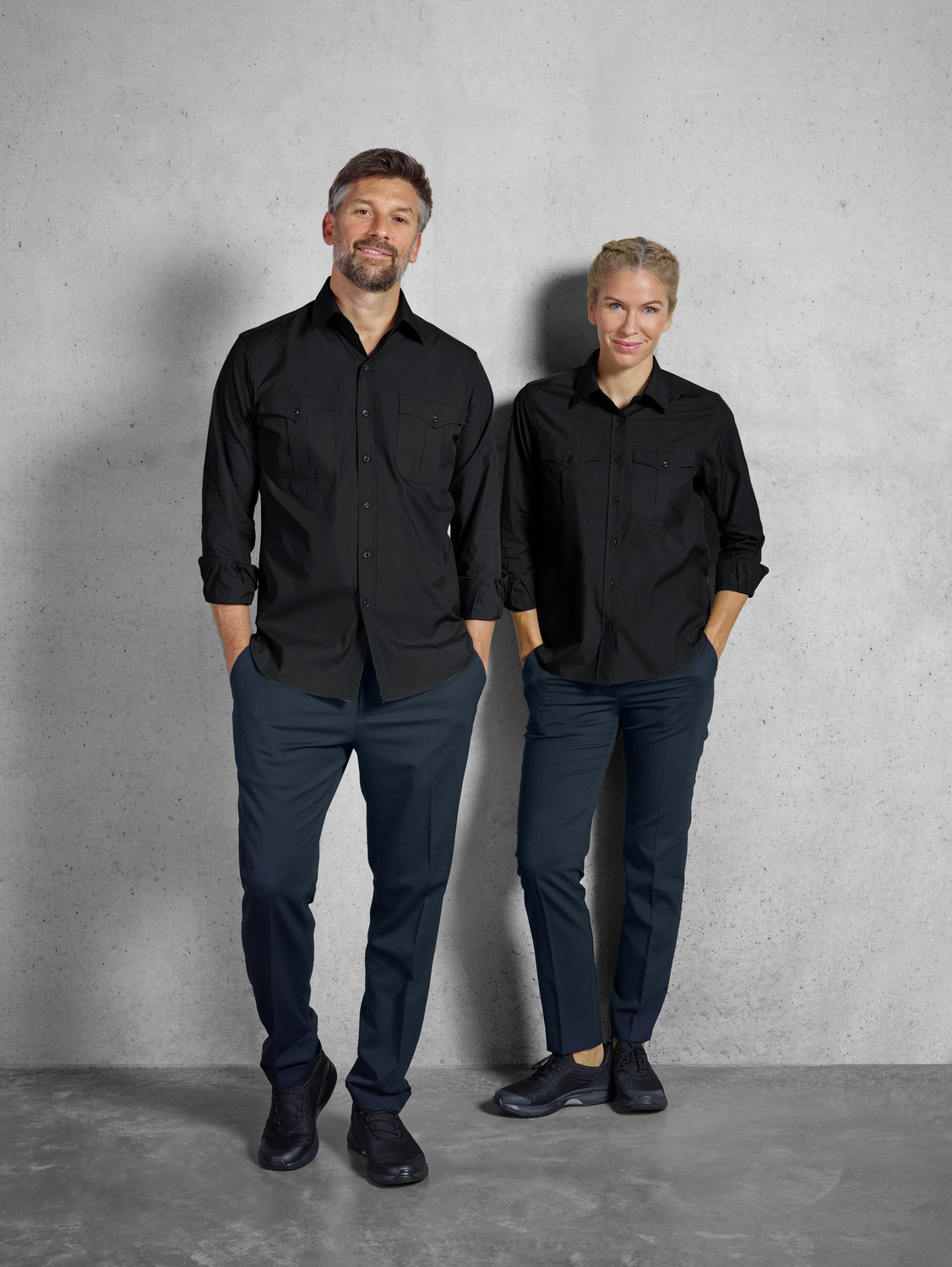 67% cotton, 33% polyester. 30°C wash. Modern, long-sleeved men’s shirt in a denim shirt look, with a visible button placket, classic shirt collar and sleeve cuffs. With two patch breast pockets and a tapered back yoke. The hem is rounded. Particularly easy-care and easy-iron thanks to the polyester content. Without waist seams. Regular fit. Back length: 80 cm for size 39/40.