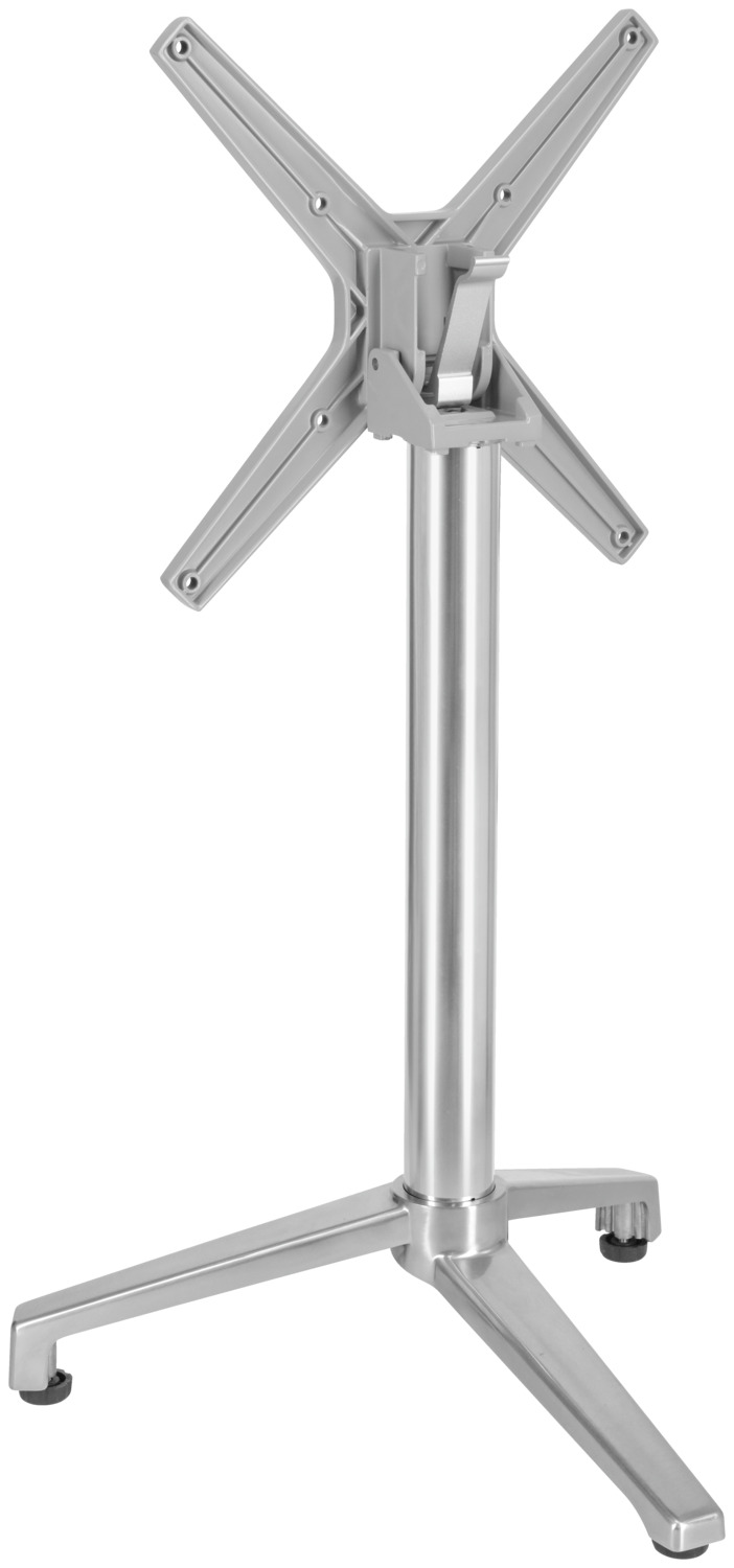 This three-legged table column for the catering trade impresses with its robust construction made of powder-coated aluminium and is ideal for mounting a wide variety of table tops. Thanks to the high-quality workmanship, the table frame is ideal for indoor use as well as for terraces, conservatories, outdoor bars and hotel lounges. The foldable table cross enables the table tops to be folded up quickly and ensures that the table frames can be stowed away to save space. Thanks to the special shape of the table legs, the table column remains stable and secure even in busy catering areas. In addition, the frame can be stacked sideways, making storage even more efficient. The table column has integrated adjusting screws to adapt to small floor irregularities. Delivery is disassembled, including all necessary assembly materials – the simple assembly saves time and makes it easier to set up large areas. * Three-legged aluminium table column – powder-coated * Folding table cross for space-saving storage * Side-stackable – ideal for efficient storage * Adjustable screws for a secure stand on uneven floors * Suitable for indoor & outdoor areas (terrace, restaurant, bar, café, hotel) * Robust, durable & specially developed for professional use * Simple assembly incl. fastening material Important for stability: Please observe the recommended table top sizes to ensure the stability of the table base in the long term.