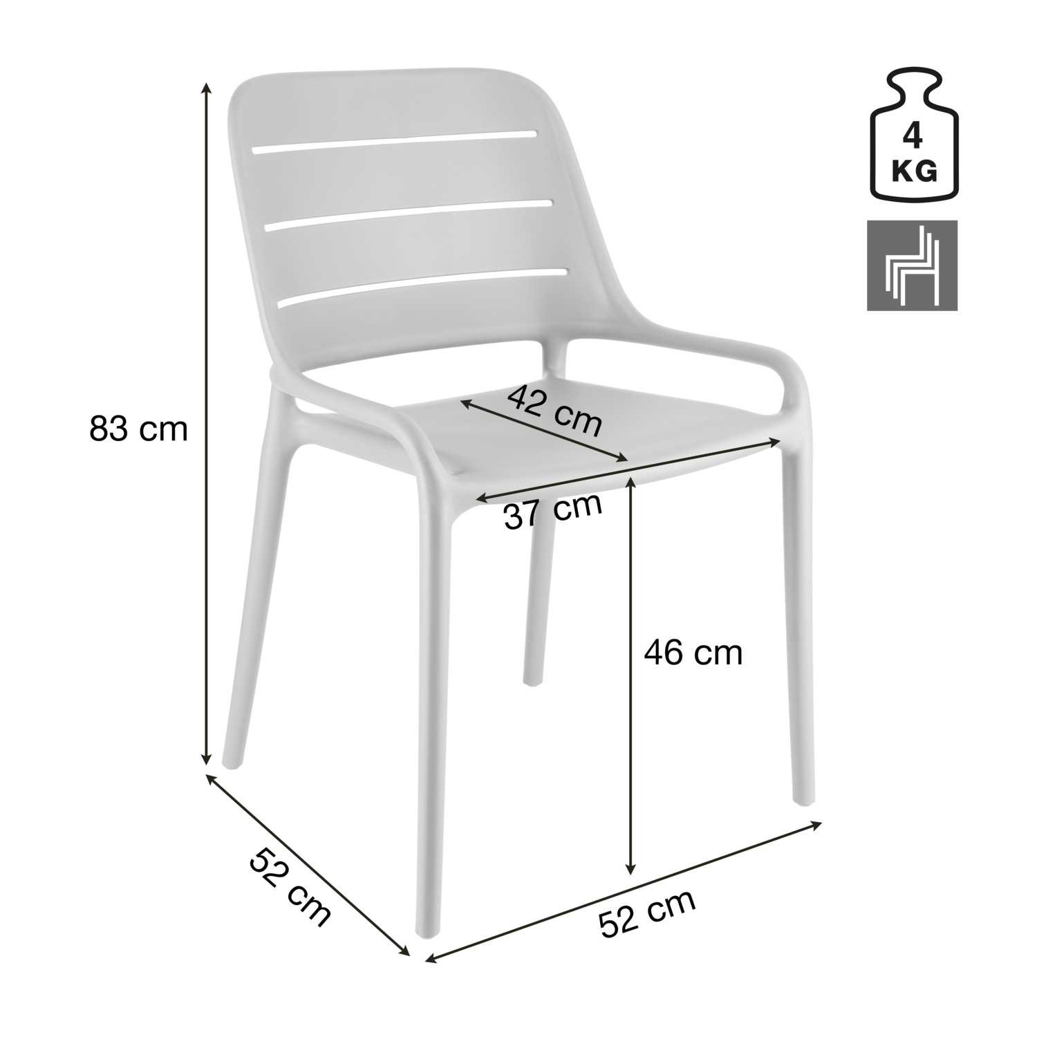 High-quality plastic chair Rylon made of fiber-reinforced polypropylene. The slotted backrest provides additional comfort and ventilation. The Rylon chair is ideal for everyday use thanks to its durability and ease of maintenance. Perfect for restaurants, cafés, bars or on terraces. Its modern and versatile design sets stylish accents and makes it a real eye-catcher. Stackable up to 6 chairs. The chair has a UV-protective coating that can withstand up to 3,000 hours of sunlight. With a load capacity of up to 150 kg, the Rylon chair is extremely resilient.