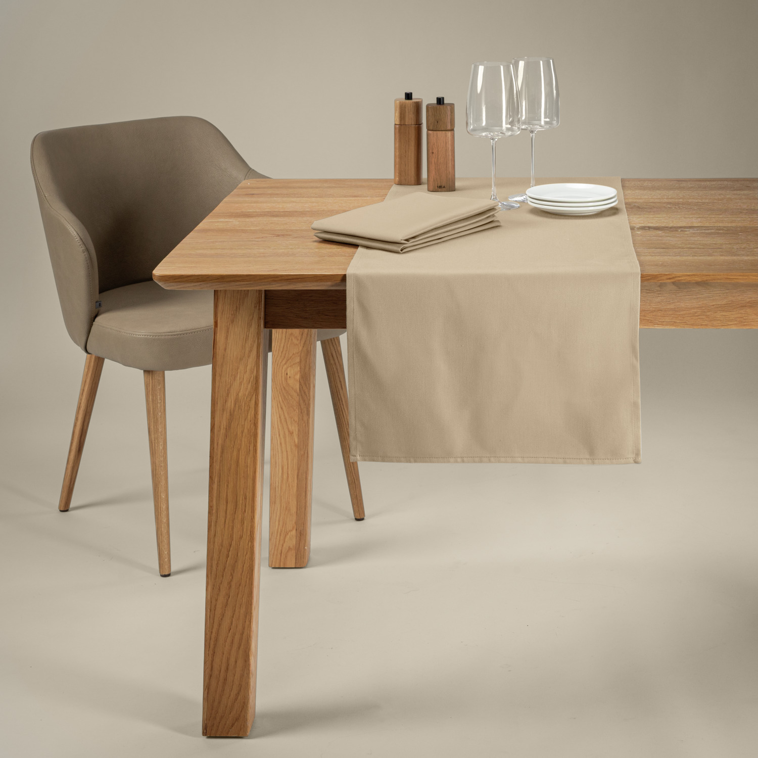 ##Cotton polyester table runner Vivienne – Noble lustre with plain satin weave The Vivienne table runner combines the natural texture of cotton with the robustness of polyester. The high-quality blended fabric ensures an elegant appearance and easy handling. The delicate satin weave provides a subtle, elegant sheen that will stylishly set the scene for your table at festive occasions or in upmarket catering establishments. The smooth, dense material is extremely dimensionally stable, durable and easy to clean. The blended fabric guarantees high durability and is suitable for both modern and classic table decorations. * 50 % cotton, 50 % polyester * Weight approx. 230 g/m² * Satin weave with an elegant lustre * Particularly smooth, dense fabric with a firm feel * Finished with 1 cm standard seam * Dimensionally stable, easy-care and hard-wearing