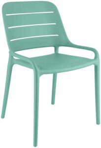 Simple armrest chair made of lightweight powder-coated aluminum (Ø frame: 3.8 cm front, 3 cm back, material thickness 1.5 cm). Seat and back made of 1.5 mm thick plastic slats in teak look. Seat surface 40×45 cm, seat height 42 cm. Rectangular chair with straight shape is weatherproof and UV-resistant. With plastic floor glides. Stackable up to 6 chairs. Suitable for outdoor use. Fits all components of the furniture series Resistance.