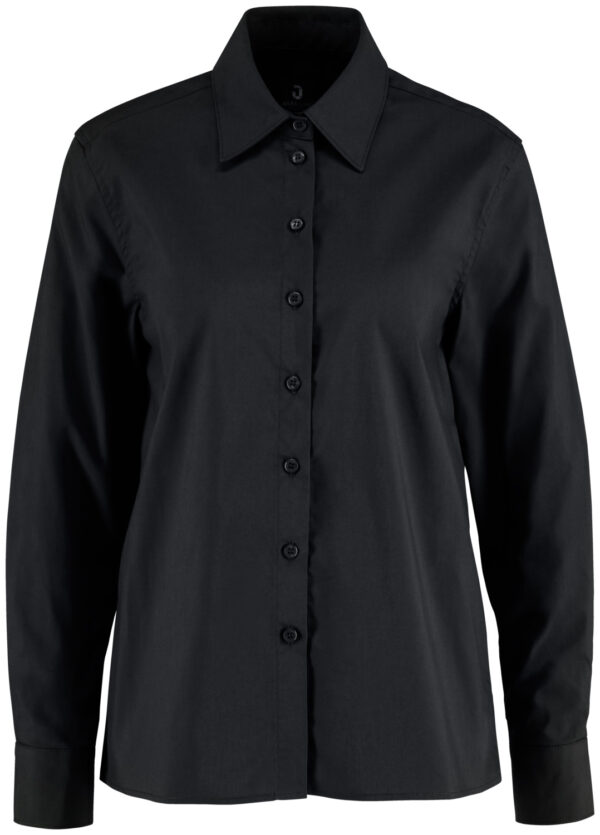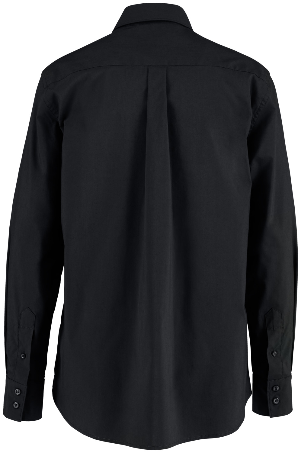 67% cotton, 33% polyester. 30° wash. Modern, casually cut long-sleeved women’s blouse with visible button placket, classic shirt collar and sleeve cuffs. With a rounded hem that is longer at the front and back. Without waist seams, with a movement pleat at the back and cut in a comfortable A-line shape. Comfort fit. Back length: 72 cm for size 36.