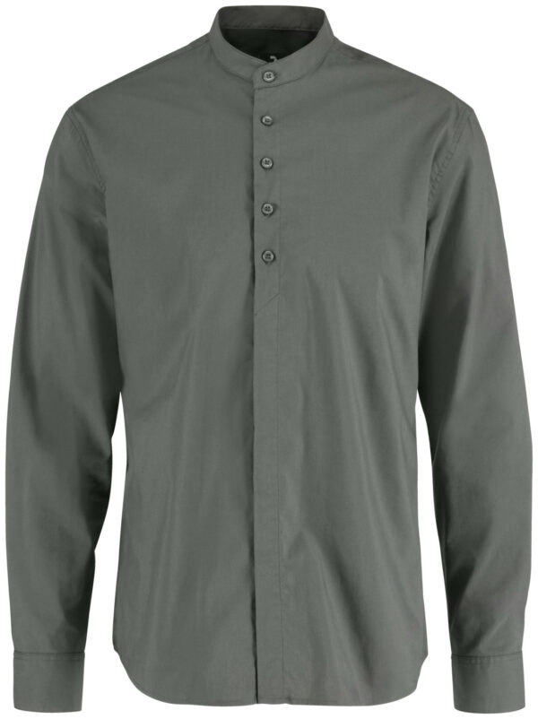 67% cotton, 33% polyester. 30°C wash. Simple, long-sleeved men’s shirt with visible button placket, short stand-up collar and sleeve cuffs. With a slight waist at the back for a perfect fit. Extra-long back and rounded hem. Particularly easy-care and easy-iron thanks to the polyester content. Regular fit. Back length: 79 cm for size 39/40.