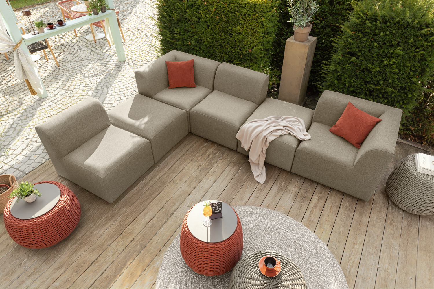 The modern corner element of our modular Gastro Outdoor Lounge offers maximum flexibility for restaurants, bars, cafés and hotels that want to create a high-quality and individualised outdoor area. Thanks to its robust, weatherproof construction, the lounge module is ideal for permanent outdoor use. The quick-drying, water-repellent cover with a high-quality foam core ensures that the corner element can be used again quickly after rain – a clear advantage in intensive everyday catering environments. With its high level of seating comfort and durable finish, the element offers a relaxed lounge experience for your guests. Thanks to its light weight, it is perfect for creating flexible corner solutions, L-shapes or spacious lounge islands. * Weatherproof lounge corner element for terrace, bar, rooftop & pool areas * Super quick-drying, water-repellent cover – ideal for frequent use * Modular design for flexible lounge configurations * High-quality, quick-drying foam core for pleasant seating comfort * Robust materials & durable workmanship * Perfect addition for gastro lounges, hotel terraces & outdoor bars * Simple connection using the supplied clamps