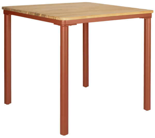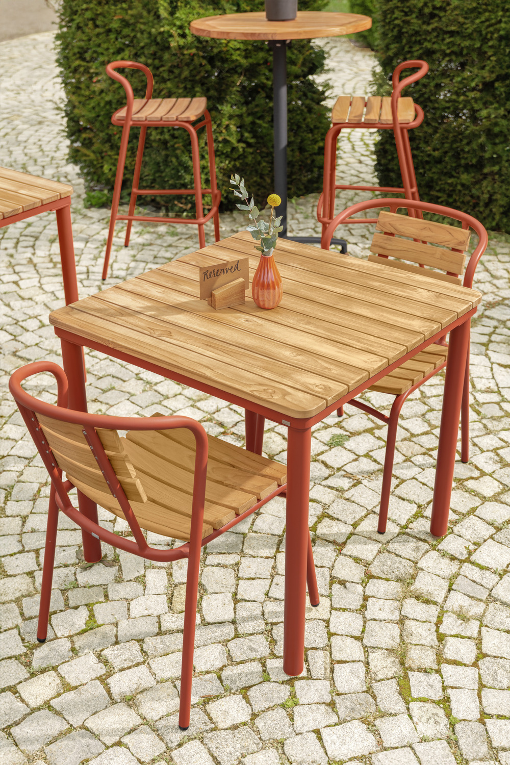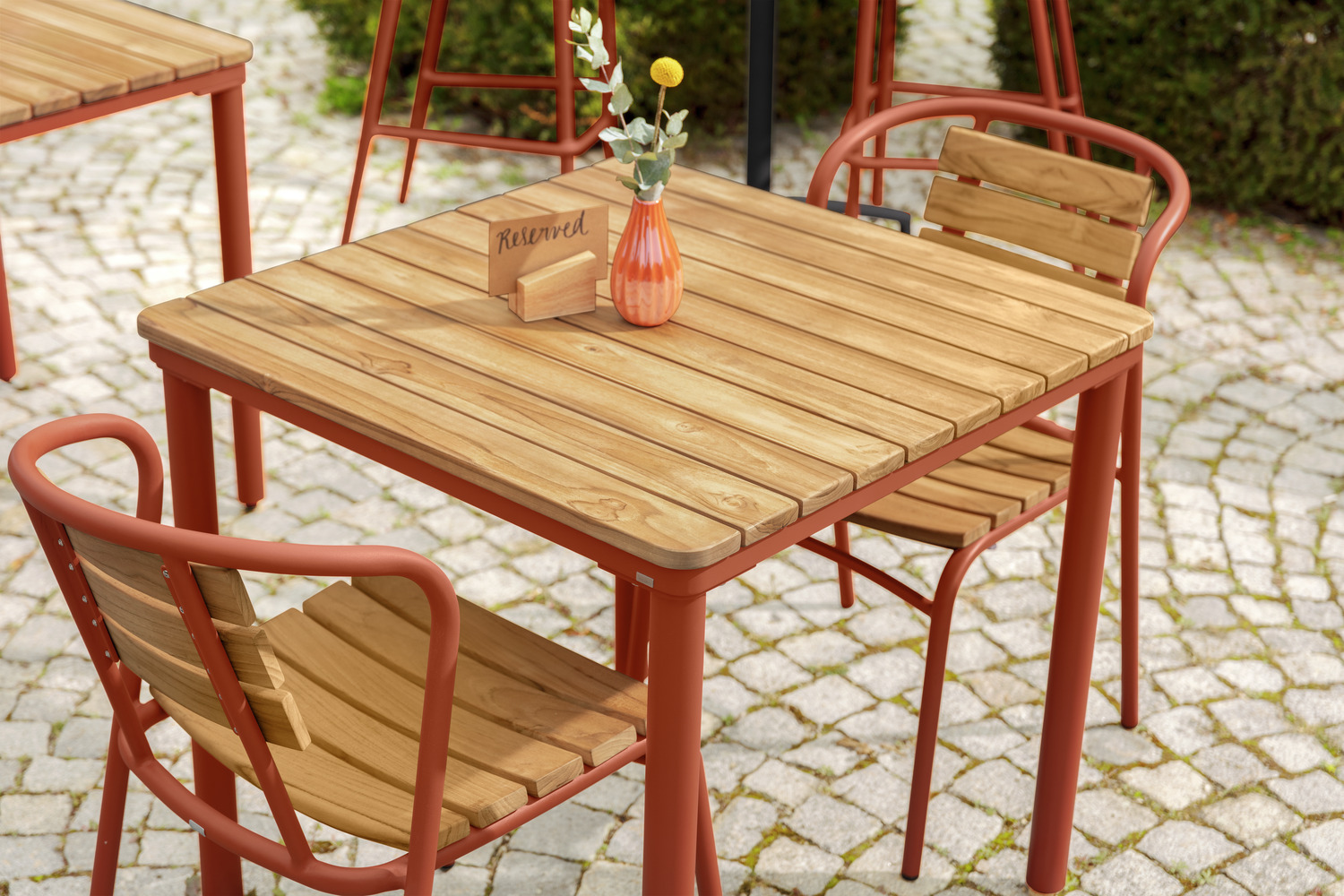 The catering outdoor table is the perfect solution for restaurants, cafés, hotels and bars that require stylish and functional tables in compact spaces. The sturdy aluminium frame with high-quality teak slats guarantees durability, an elegant look and excellent weather resistance – ideal for intensive indoor and outdoor use. Thanks to its practical size, the table is particularly suitable for smaller patios, bistro areas and narrow seating groups, without sacrificing elegance or stability. It is weatherproof, UV-resistant and is supplied disassembled. You can order matching catering chairs at the same time. **Teak care instructions – ideal for everyday catering** Our teak slats are made of high-quality, untreated teak, which remains permanently stable even when exposed to the elements. We recommend allowing the wood to weather naturally so that the typical silver-grey teak patina develops. Maintenance is simple: warm water + soft brush. If you want to preserve the original wood colour, you can oil the teak 1-2 times a year. * Space-saving catering table 80 × 80 cm – ideal for small terraces & cafés * Aluminium frame & teak slats – weatherproof & UV-resistant * Stylish wood look for an authentic outdoor atmosphere * Perfect for 2-4 people * Adjustable screws for a secure stand on uneven ground * Delivery is disassembled – easy assembly * Order matching chairs directly * Easy to clean & extremely durable The perfect outdoor catering table for compact seating areas.
