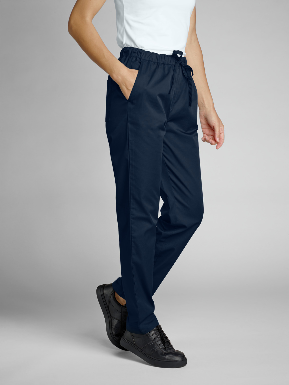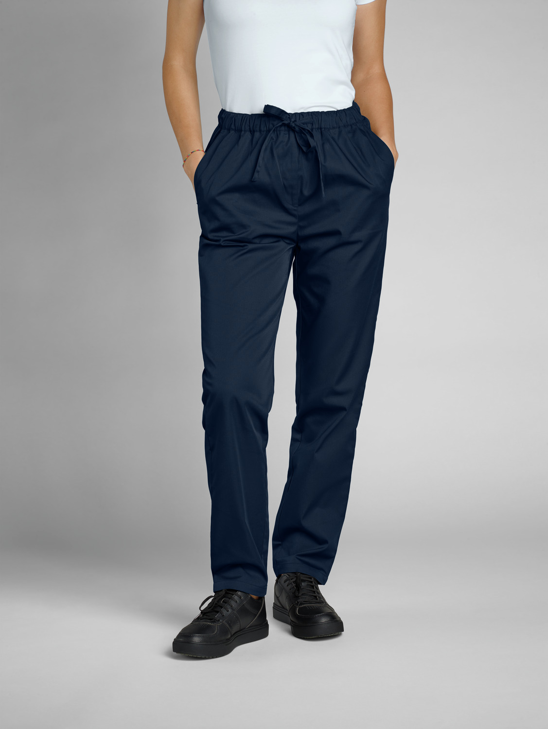 65% polyester, 35% cotton. 150 g/m². 60°C wash. Women’s chef trousers with fully elasticated waistband, made from an extra-light and breathable fabric. With side pockets, two patch back pockets and ties at the waistband to adjust and fix the waist size. Comfortable, loose fit with trouser legs that taper slightly towards the bottom. Inside leg length: 77 cm for size S.